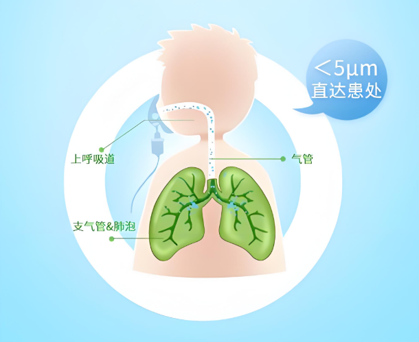 雾化颗粒细腻 :药液被雾化为微米级颗粒,雾化颗粒中位粒径:3.6㎛±25%;5㎛以下雾粒占比:>60%,更容易直接被呼吸道吸收(从口腔、咽喉、气管、支气管、直达肺泡),有助于达到更好的治疗效果。